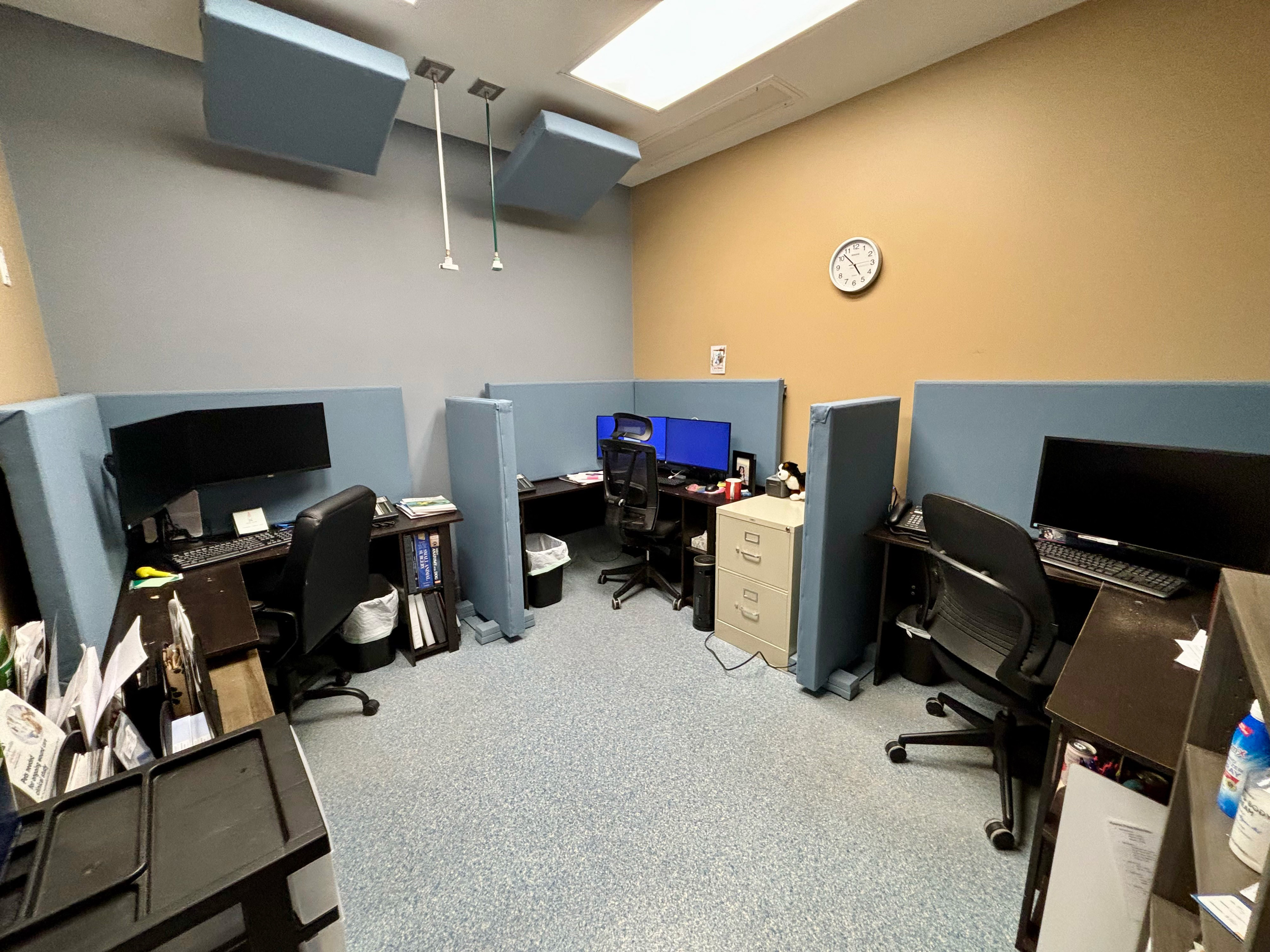 Limited available wall space for absorption of primary sound sources necessitated custom-built acoustical devices that serve multiple functions. Absorptive panels with a tackable section allowed for pinning notes and communiqué at each workstation while also using an atypical material density that was most effective for improving speech intelligibility and maintaining healthy indoor air quality by avoiding commonly used formaldehyde-based binders. The room gained an increase in both functional space and noise absorption.